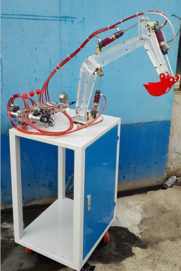 實(shí)訓(xùn)臺(tái)主要由底柜,透明大臂,透明斗桿,透明挖斗(紅色),透明油缸,透明集成閥島,透明手動(dòng)換向閥,透明電磁閥,旋缸馬達(dá),減速器等成