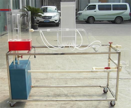 主要配置:移動式不銹鋼實驗臺;有機玻璃整流穩(wěn)壓水箱;高位突擴突縮粗、細管,閥門;測壓板;實驗管道及控制閥門;計量箱;水箱;防腐潛水泵等。
