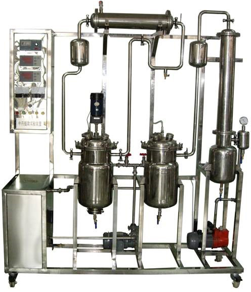 中藥提取實驗裝置由提取罐、蒸發(fā)器、攪拌電機、列管式加熱器、冷凝器、油分器、收油器、藥液泵、貯液罐、過濾器、真空泵、調(diào)速器、數(shù)顯溫度儀、不銹鋼框架、控制屏等組成。提取罐、蒸發(fā)器配導熱油加熱系統(tǒng),提取罐、蒸發(fā)器頂部蒸汽出口均設置了除沫器。